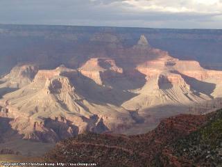 I relaxed in the room while my mother was doing some souvenir shopping in the Village, and then we headed for an early dinner. After this, we were standing close to the Bright Angel Trailhead and there was a thunderstorm passing through the canyon, which along with the sunset provided some spectactular scenery. For the first time that day, I began to understand people's fascination with Grand Canyon, and proceeded to shot one picture after another of the changing colors and stark contrasts that the evening sun provided. Shadwows were gradually longer, rainclouds passing through the canyon, and then to top it all of, a rainbow appeared.